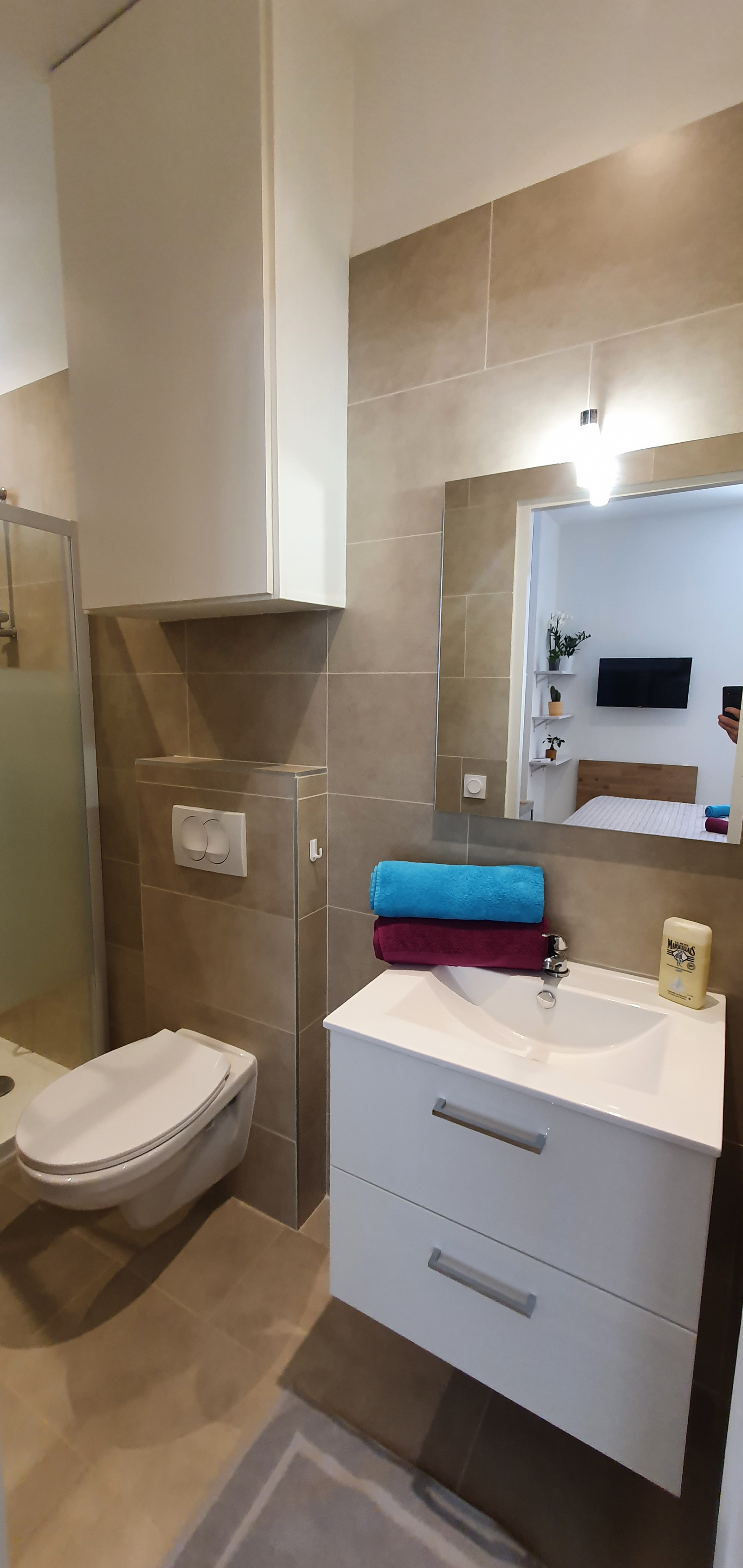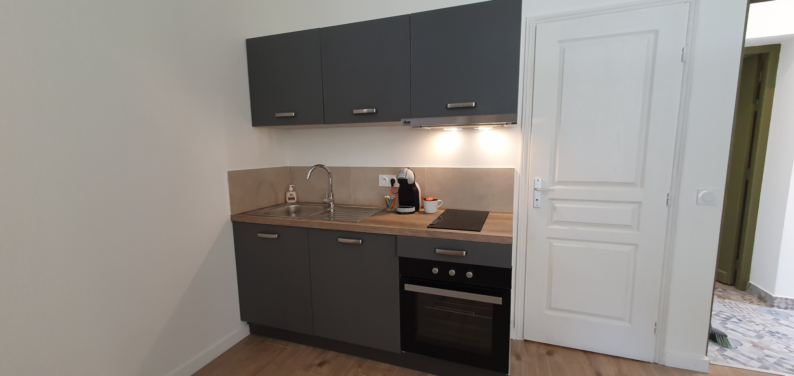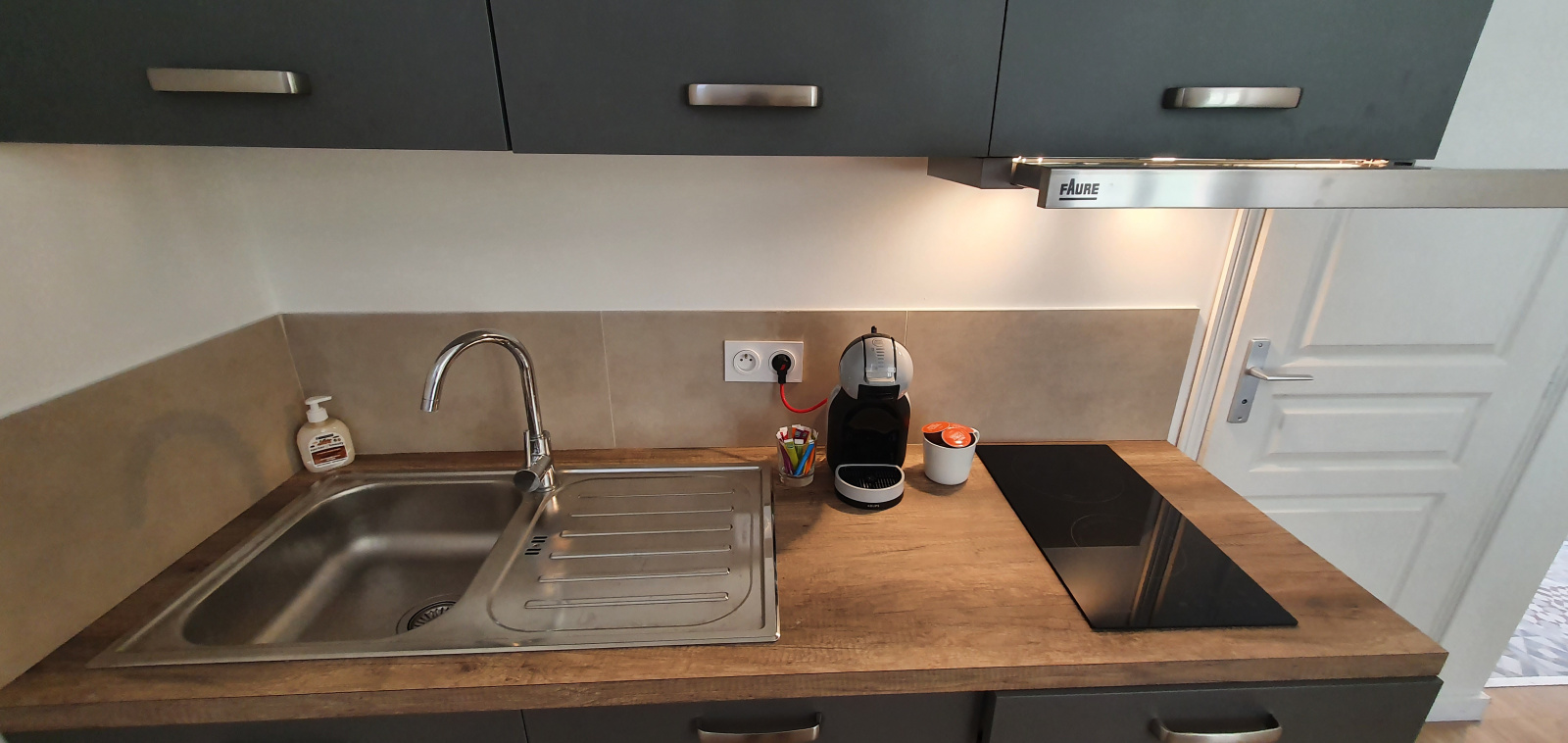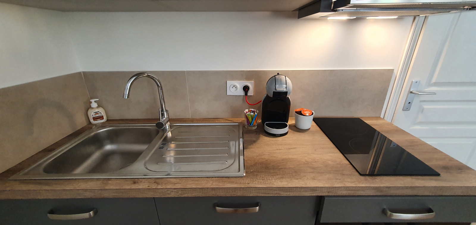 De l'eau fraiche, des capsules de café du linge neuf et confortable, produit à douche et serviettes neuves pour vous accueillir.