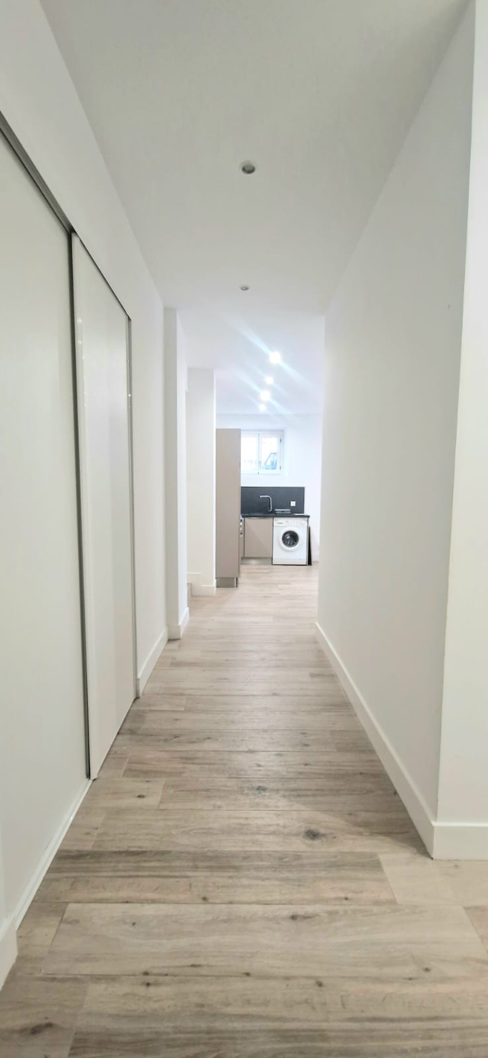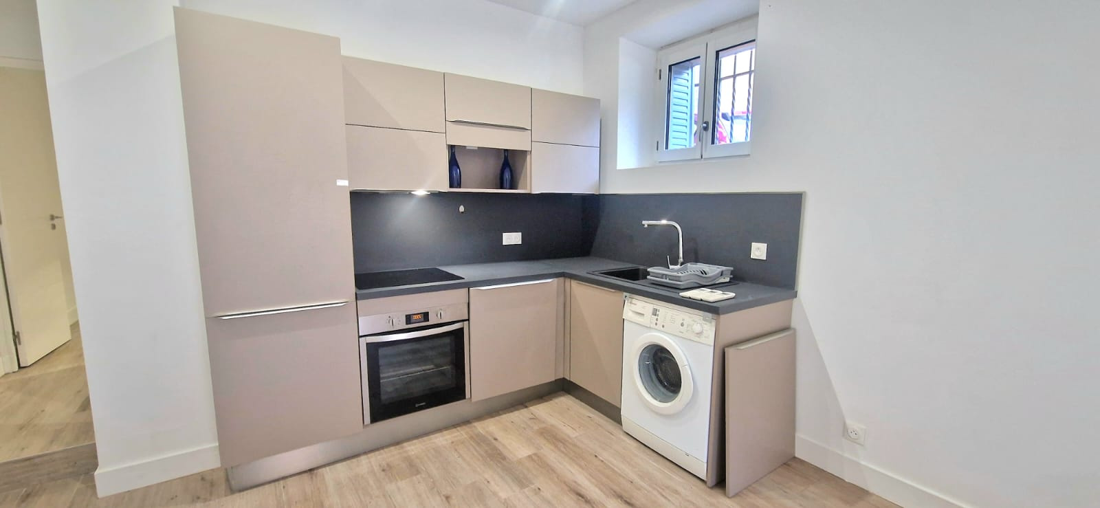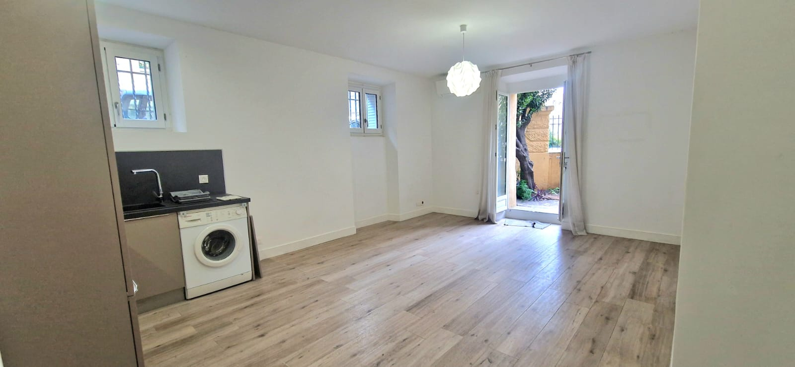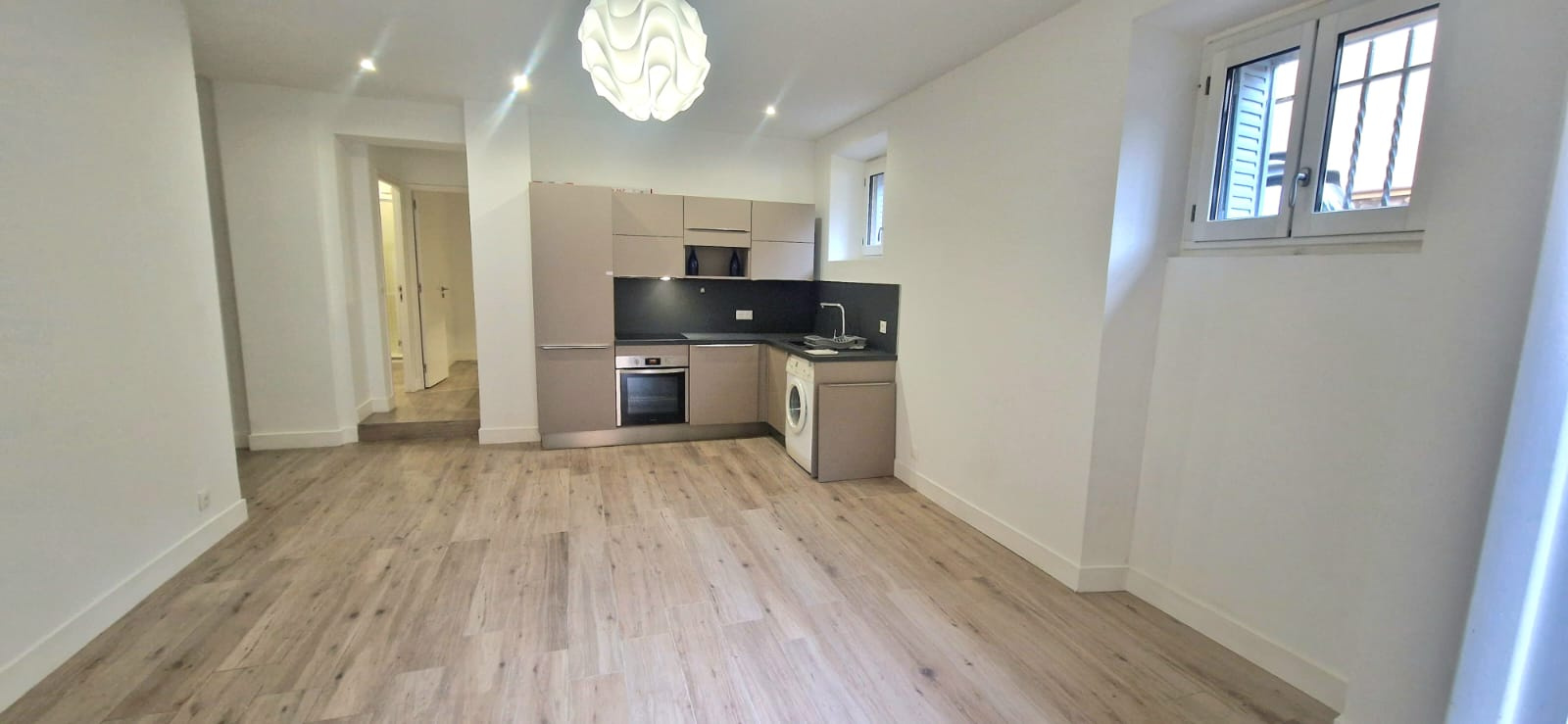 Les prestations sont de qualité : parquet bois clair, double vitrage, murs blancs, cuisine neuve, et belle hauteur sous plafond.