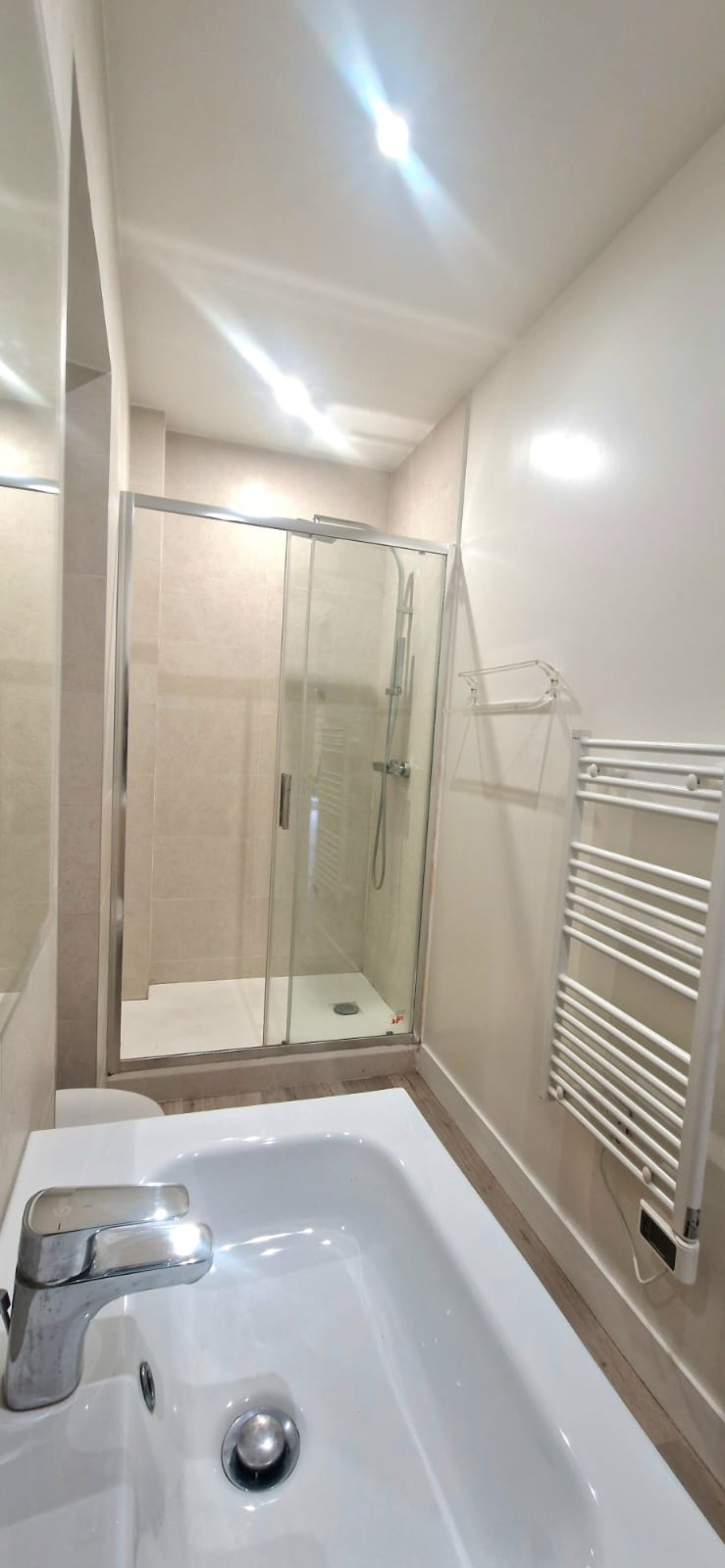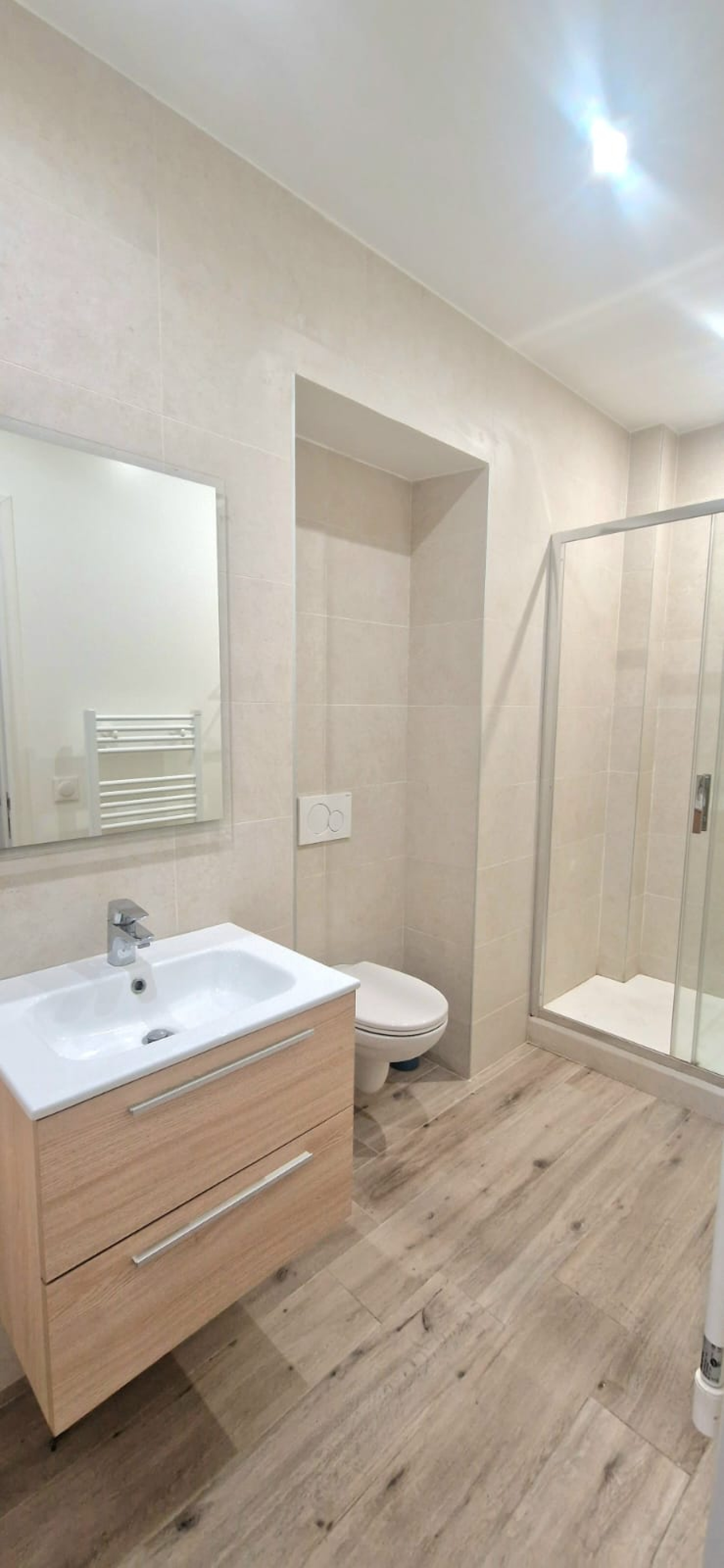 Une seconde Master bedroom avec rangements placards salle d’eau contemporaine, douche à l’italienne, meuble vasque et WC suspendus.
