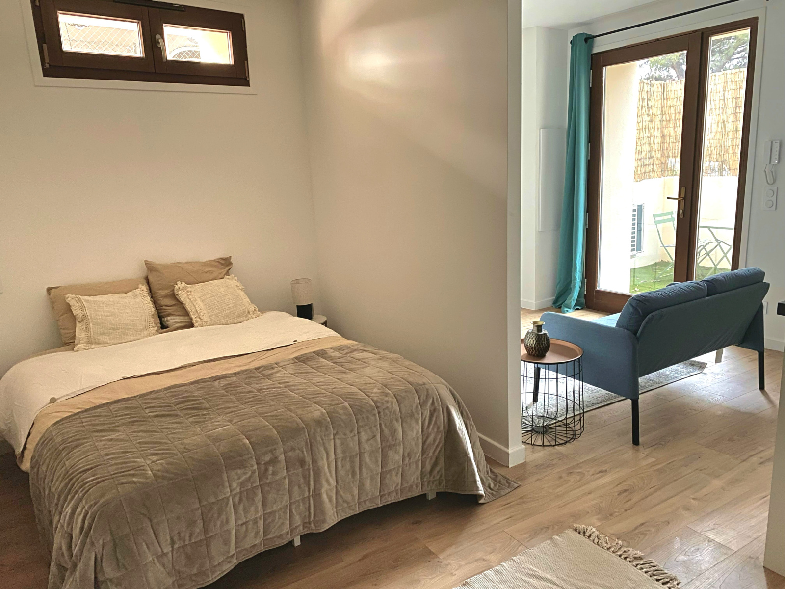 En Rez de jardin d'un bâtiment de 2 étages, cet appartement de 21.67 m² entièrement refait à neuf comprend un séjour avec un coin cuisine équipée, une Alcove chambre ,une salle d'eau avec WC, une terrasse exposée sud de 7 m²