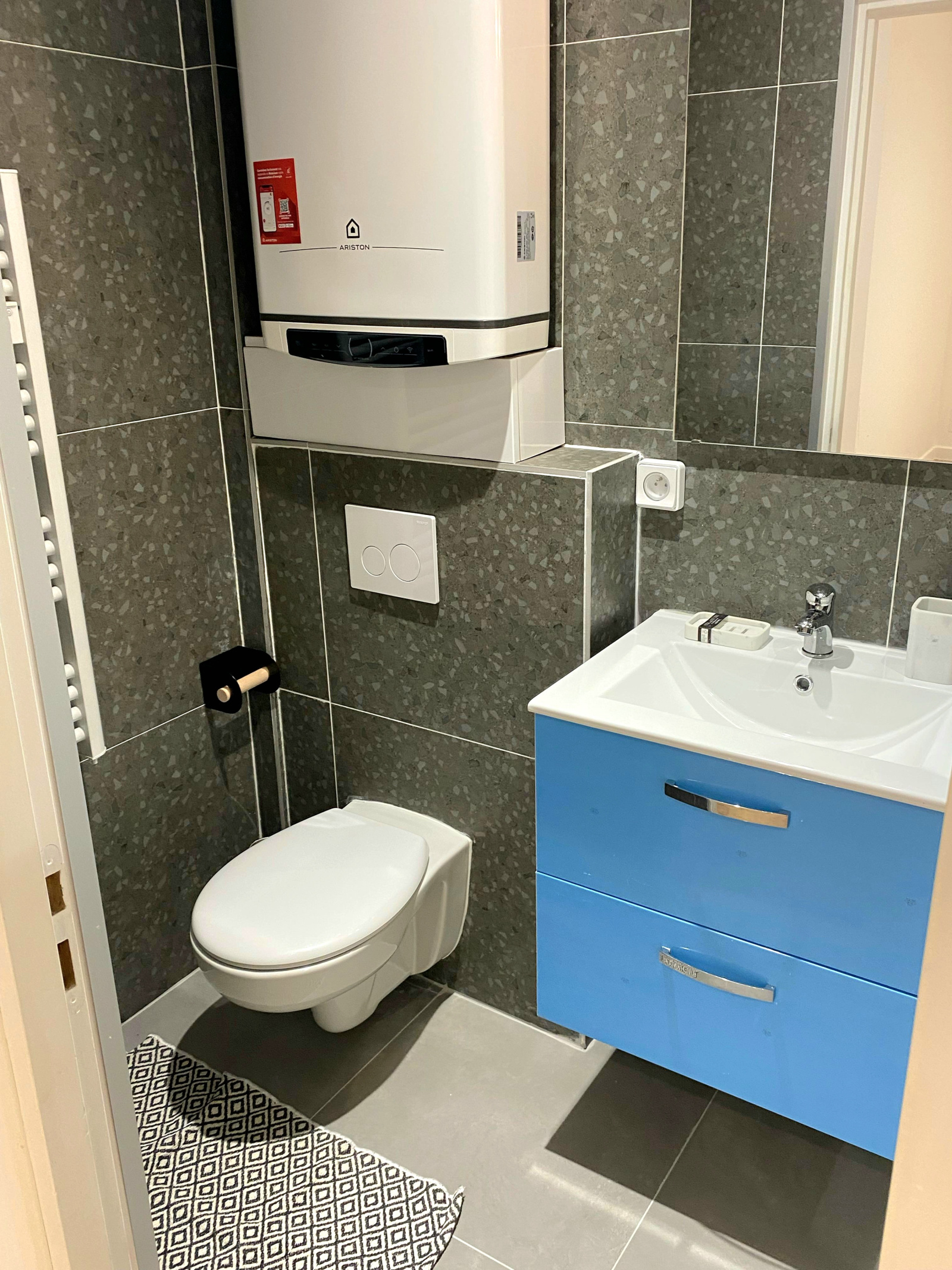 - Carrelage 60 cm X 60 cm pour la salle de douche et parquet pour la pièce de vie.