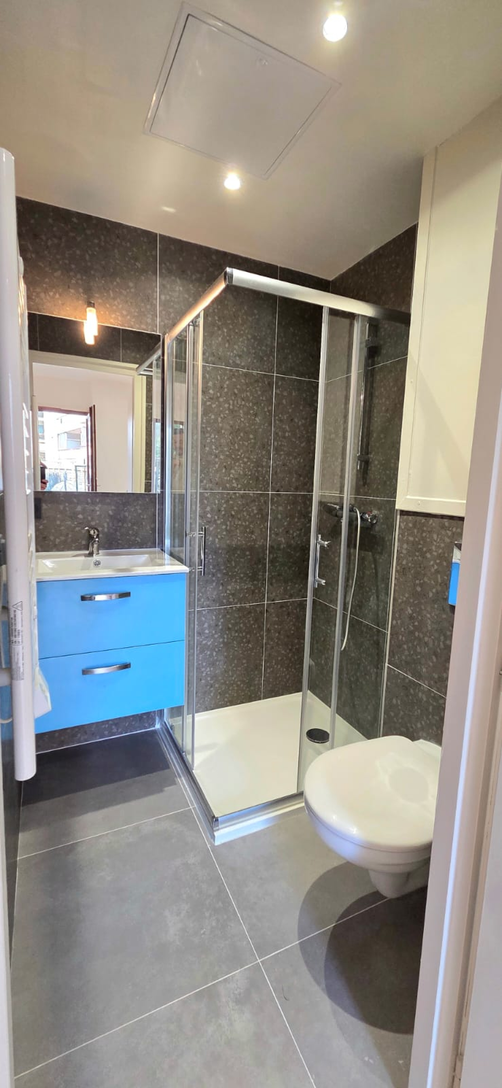- Carrelage 60 cm X 60 cm pour la salle de douche et parquet pour la pièce de vie.