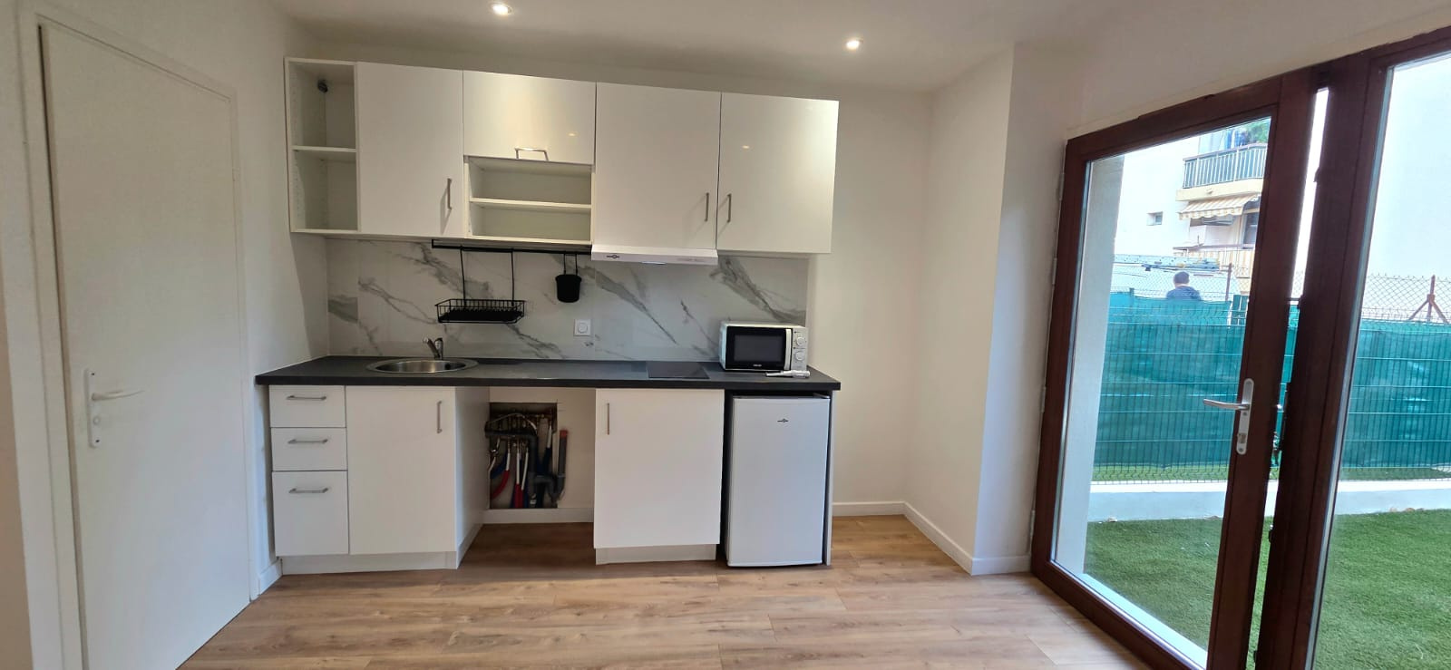 - Cuisine équipée (meubles hauts et bas, plaque de cuisson, hotte, frigidaire, four combiné grill et micro-ondes).