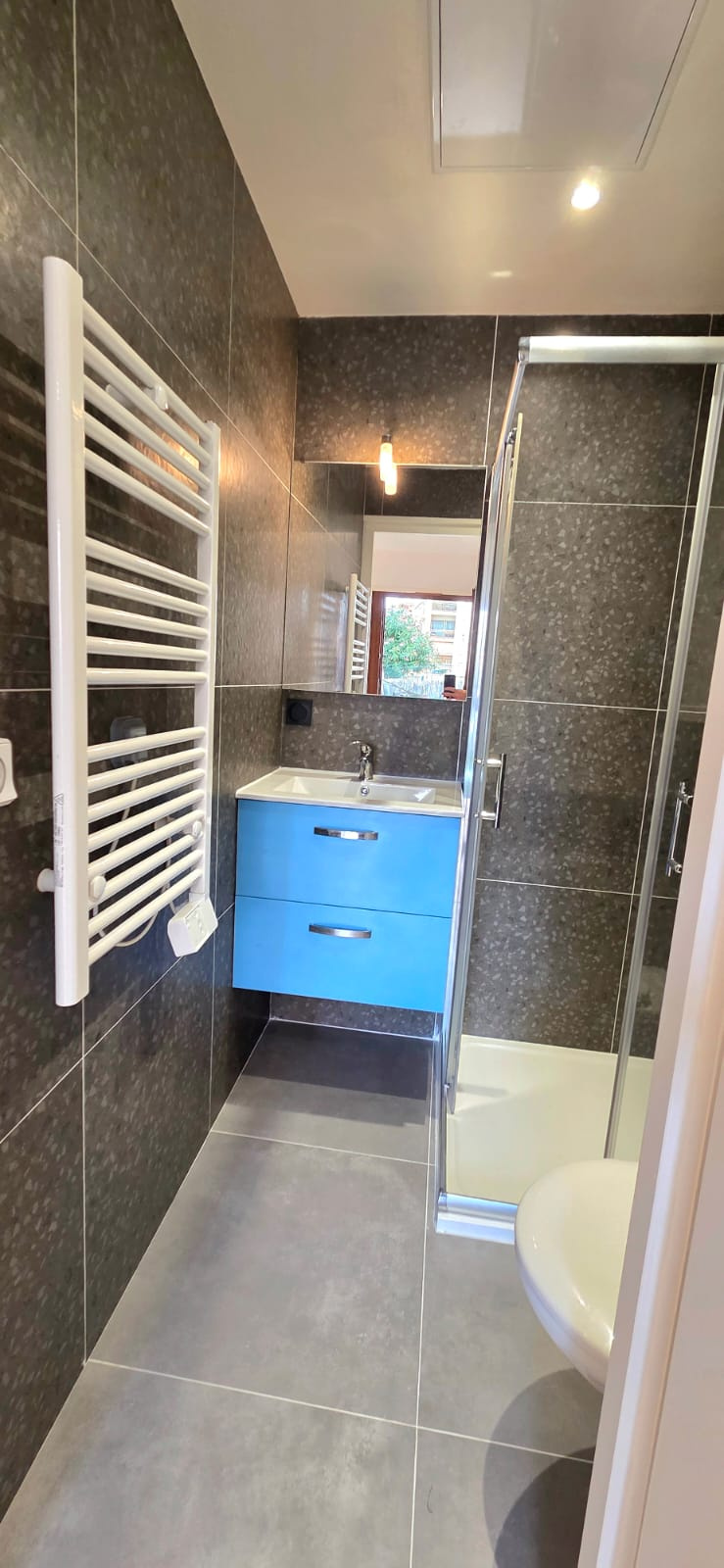 - Salle de Douche équipée (receveur de douche extra-plat, paroi vitrée, meuble vasque, miroir lumineux, sèche serviette).