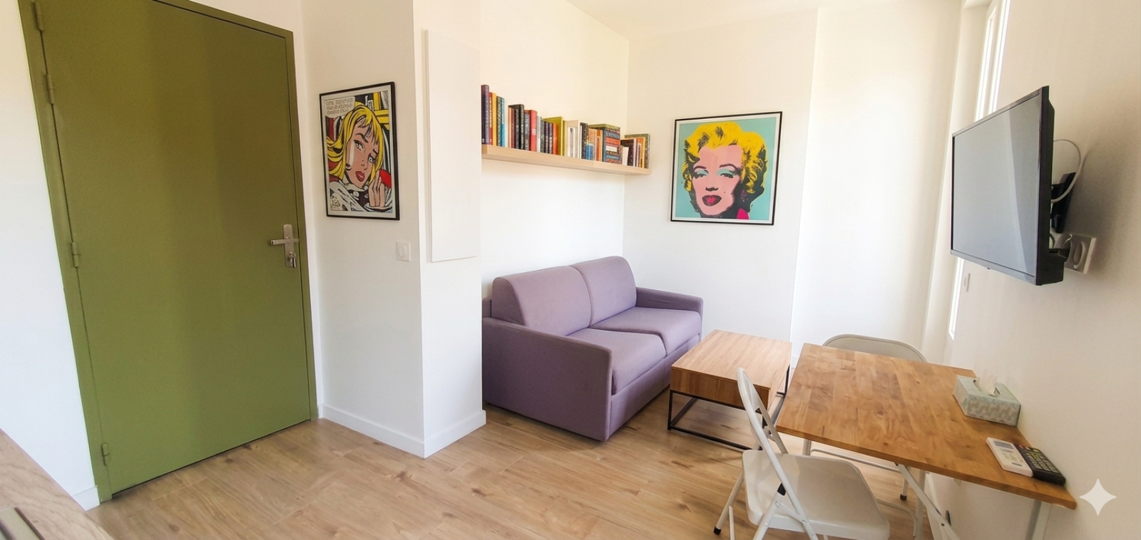 Cet appartement offre une entrée, séjour, coin cuisine super équipée, vaisselle complète, four, hotte, plaques 2 feux vitro céramique, frigo, salle d'eau avec WC suspendus, douche avec paroi, rangements placards, climatisation réversible individuelle , jardin commun, télévision, canapé lit ESCAMOTABLE de grande qualité (2700€), table basse et chaise.Double vitrage